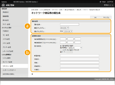 Transport Layer Security(TLS)を使った暗号化通信に必要な鍵ペアを生成できます。TLSは、リモートUIを使って本機にアクセスするときに使用できます。本機に登録できる鍵ペアはプリインストールされている鍵ペアと合わせて最大5つです。「ネットワーク通信用」に生成した鍵ペアでは自己署名証明書が使われます。「鍵と証明書署名要求(CSR)」では、本機で生成した鍵ペアに対して認証局発行の電子証明書を申請することができます。