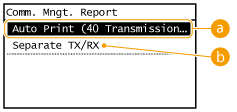 Tap <On> to print sent and received reports separately, or <Off> to print both reports on one sheet.