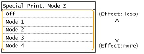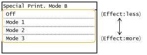 By specifying <Off> or <Mode 1>, streaks may adhere to the print paper. By specifying <Mode 3> or <Mode 4>, outlines may be blurred or images may appear somewhat grainy. The print density becomes lighter as the setting progresses from <Off> to <Mode 4>.