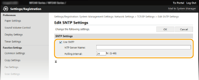 ![]() | Simple Network Time Protocol (SNTP) enables you to adjust the system clock by using the time server on the network. The protocol is typically used for synchronizing the machine and a server. The time is adjusted based on Coordinated Universal Time (UTC), so specify the time zone setting before configuring SNTP (Date/Time Settings). SNTP settings can be specified via the Remote UI. |