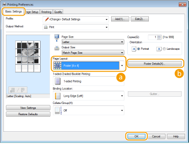 [Basic Settings] tab  In [Page Layout], select the dimensions of your poster (for example, [Poster [2 x 2]]) [OK]