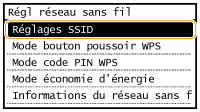 Réglages de sécuritéSi la connexion sans fil est configurée en sélectionnant un routeur sans fil, la méthode d'authentification WEP est réglée sur <Open System> ou la méthode de cryptage WPA/WPA2 sur <Auto>(AES-CCMP ou TKIP). Si vous voulez sélectionner <Clé partagée> en guise d'authentification WEP ou <AES-CCMP> pour le cryptage WPA/WPA2, vous devez configurer la connexion à l'aide de la méthode de cryptage manuelle ( Configuration de la connexion par la définition des réglages détaillés). |