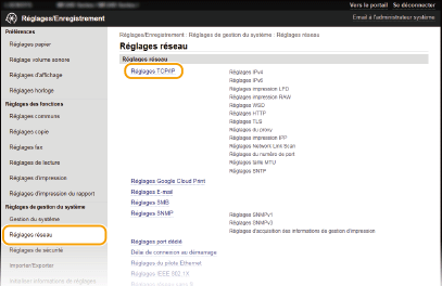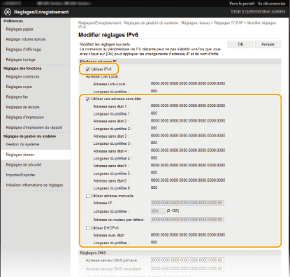Vérifier si les réglages sont correctsAssurez-vous que l'écran de l'IU distante s'affiche sur votre ordinateur avant d'utiliser l'adresse IPv6 de l'appareil. Démarrage de l'interface utilisateur distante Utilisation du panneau de commandeLes paramètres IPv6 sont également accessibles depuis <Menu>, dans l'écran <Accueil>. Réglages IPv6 |