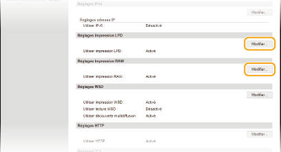 Configuration de LPD ou RAW1 | Cliquez sur [Modifier] dans [Réglages impression LPD] ou [Réglages impression RAW]. ![]() |