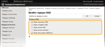 2 | Configurez les réglages comme il convient. ![]() [Utiliser impression WSD ] Cochez la case pour imprimer via WSD. Si tel n'est pas le cas, désactivez cette case. [Utiliser navigation WSD ] Cochez la case pour obtenir des informations sur l'appareil à partir d'un ordinateur via WSD. Cette case à cocher est automatiquement sélectionnée lorsque la case [Utiliser impression WSD ] est cochée. [Utiliser lecture WSD ] Disponible sous Windows Vista/7/8/10, la numérisation WSD permet de numériser les documents vers un ordinateur sans installer de pilote de scanner. Cochez la case pour numériser les documents à l'aide de WSD. Lorsque vous n'utilisez pas la numérisation WSD, désactivez la case. [Utiliser lecture ordinateur ] Cochez la case pour utiliser la numérisation WSD en employant l'appareil comme panneau de commande. Il n'est possible de cocher cette case que si la case [Utiliser lecture WSD ] est cochée. Pour lancer la numérisation, appuyez sur <Lecture> et spécifiez l'ordinateur de destination de la numérisation relié via WSD (Numérisation à partir de l'appareil). [Utiliser découverte multidiffusion ] Cochez la case pour configurer l'appareil de façon à ce qu'il réponde aux messages de découverte par multidiffusion. Si la case est désélectionnée, l'appareil reste en mode de veille même si des messages de découverte par multidiffusion circulent sur le réseau. |
