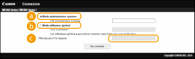 Sélectionnez [Mode administrateur système] ou [Mode utilisateur général], puis saisissez le code PIN approprié dans [PIN d'accès à l'IU distante ] au besoin.