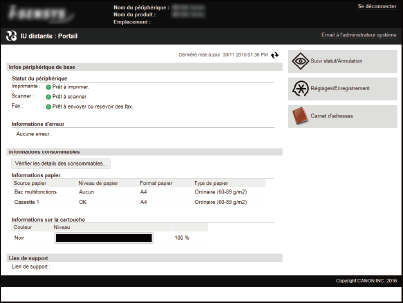 [Mode utilisateur général]Vous pouvez vérifier l'état des documents ou de l'appareil et modifier certains réglages. Si vous désirez supprimer les documents imprimés, renseignez le nom de l'utilisateur associé aux documents dans [Nom d'utilisateur ]. Le nom d'utilisateur est automatiquement défini pour les documents imprimés selon les informations telles que le nom de l'ordinateur ou le nom de connexion à l'ordinateur.