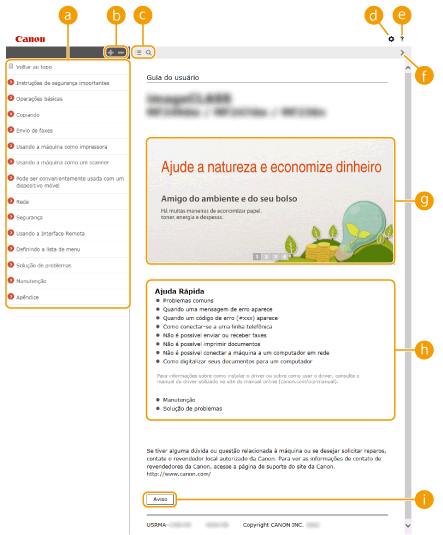 O Guia do usuário é dividido em telas diferentes e o conteúdo de cada tela varia.