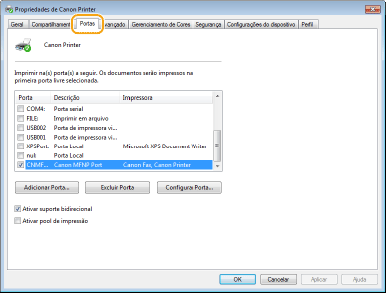 Clique na guia [Portas] e verifique se a caixa de seleção [Ativar suporte bidirecional] está marcada.