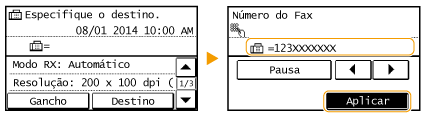 4 | Toque em <Pausa> para inserir uma pausa no final do número de fax conforme necessário. O tempo de espera inserido aqui é fixado em 10 segundos. Este tempo não pode ser alterado. ![]() |