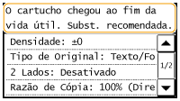 A máquina irá exibir uma mensagem quando o cartucho de toner estiver praticamente vazio. Observe que a qualidade de impressão fica empobrecida se você continua a imprimir sem tomar nenhuma providência. Você pode verificar o nível do cartucho de toner na tela.