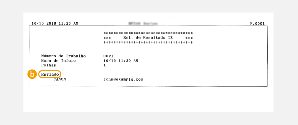 Por e-mail, o Relatório de Resultado TX indica o resultado de transmissão entre a máquina e o servidor de e-mail, não entre a máquina e o endereço de destino. Mesmo se a transmissão falhar, um código de erro de três dígitos não poderá ser impresso. Para verificar o código de erro, imprima um Relatório de Gerenciamento de Comunicação (