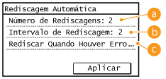 Especifique as configurações para Rediscagem automática, uma função que disca novamente automaticamente após vários minutos se a primeira tentativa falhar devido à linha ocupada. Você pode especificar quantas vezes a máquina disca novamente e intervalo entre as ligações.