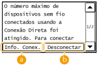 | | | | Conectando a partir de um dispositivo móvel Com base no SSID e chave de rede exibidos no visor, faça as configurações da conexão LAN sem fio para conectar à máquina. A tela abaixo aparece no visor durante o processo de conexão. | | <Info. Conex.> Você pode visualizar as informações da Conexão Direta antes de continuar. | | | <Desconectar> Pare o procedimento de Conexão Direta. Quando a impressão, digitalização ou outra operação desejada terminar, toque neste botão para encerrar a conexão. |