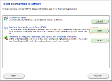 Clique em [Iniciar] para [Assistente de instalação sem fio Canon MF/LBP].