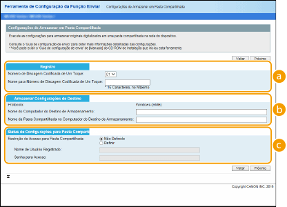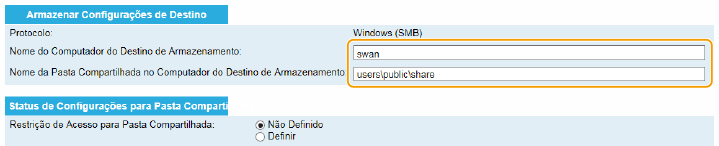 Clique no botão de opção [Não Definido] ou [Definir] para corresponder com as restrições de acesso definidas para a pasta compartilhada. Quando [Definir] for selecionado, digite o nome do usuário na caixa de texto [Nome de Usuário Registrado] e a senha na caixa de texto [Senha para Acesso].