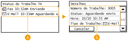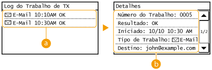 2 | Selecione o documento cujo registro você deseja verificar. ![]() <Log do Trabalho de TX>Exibe uma lista de documentos que foram enviados. <OK> é exibido quando um documento é enviado com êxito e <Erro> é exibido quando um documento não é enviado porque foi cancelado ou ocorreu um erro. <Detalhes>Exibe informações detalhadas sobre o documento selecionado a partir da lista. ![]() Quando um número de três dígitos é mostrado no caso de <Erro> Este número representa um código de erro. Quando um código de erro aparece |