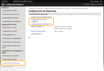 Clique em [Configurações de Chave e Certificado] para instalar um par de chaves ou em [Configurações de Certificado CA] para instalar um certificado de CA.