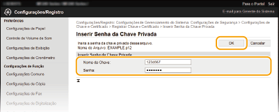 2 | Insira o nome do par de chaves e senha e, em seguida, clique em [OK]. [Nome da Chave] Digite até 24 caracteres alfanuméricos para o nome do par de chaves a ser registrado. [Senha] Digite até 24 caracteres alfanuméricos para a senha do conjunto de chave privada para o arquivo a ser registrado. |
