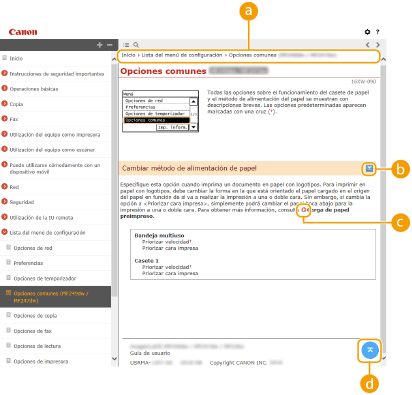 Haga clic para especificar opciones como el tamaño de texto, el formato y el método de visualización de la Guía de usuario.