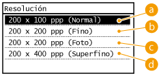 ![]() | Puede seleccionar la resolución más adecuada según su tipo de documento. Cuanto mayor sea la resolución, más nítida será la imagen, pero más tiempo tardará en enviarse. |