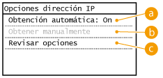 3 | Compruebe que <IP automática> esté establecido en <On>. Si está seleccionado <Off>, cambie la opción a <On>. |