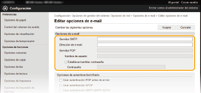 Utilice la IU remota para configurar las opciones detalladas de envío, como pueden ser las opciones para la autenticación de POP y el cifrado de la comunicación antes de enviar e-mails. Póngase en contacto con su proveedor o administrador de red para obtener la configuración necesaria.