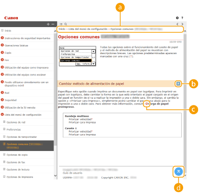 Haga clic para especificar opciones como el tamaño de texto, el formato y el método de visualización de la Guía de usuario.