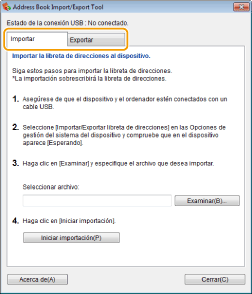 Utilice la herramienta Address Book Import/Export Tool con el equipo y el ordenador conectados mediante un cable USB.