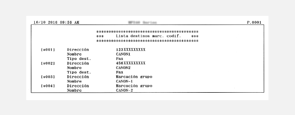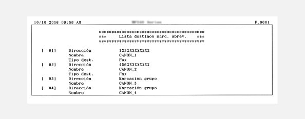 Puede consultar la lista de destinos registrados en la libreta de direcciones como <Marcación codificada>, <Teclas abreviadas> y <Marcación grupo> imprimiendo una Lista de direcciones.