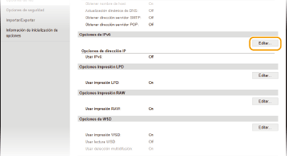 Las direcciones IPv6 del equipo pueden configurarse a través de la IU remota. Antes de configurar direcciones IPv6, compruebe las opciones de la dirección IPv4 (Visualización de las opciones de IPv4). Debe establecer las opciones de IPv4 correctas para poder utilizar direcciones IPv6. Tenga en cuenta que la función de escaneado que utiliza el controlador de escáner o MF Scan Utility no está disponible en los entornos IPv6. El equipo puede utilizar hasta nueve de las siguientes direcciones IPv6: