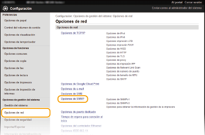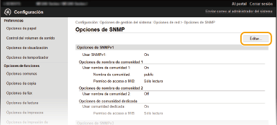 También podrá especificar las opciones de SNMPv1 y habilitar/deshabilitar las opciones de SNMPv3 desde <Menú> en la pantalla <Inicio>. Opciones de SNMP