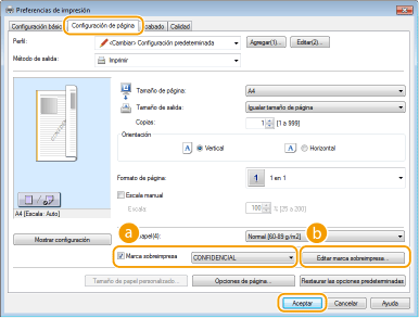 Pestaña [Configuración de página] Marque la casilla de verificación [Marca sobreimpresa]  Seleccione una marca sobreimpresa en la lista desplegable [Aceptar]