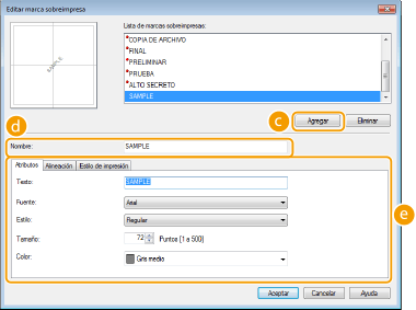 Puede imprimir marcas sobreimpresas tales como "COPIA" o "CONFIDENCIAL" en el documento. Puede crear nuevas marcas sobreimpresas o utilizar marcas sobreimpresas registradas previamente.