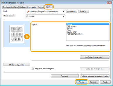 Seleccione una opción que se adapte al tipo de documento o al propósito de la impresión. Por ejemplo, seleccione [General] para uso general o seleccione [Fotos] cuando desee imprimir imágenes fotográficas con una calidad de impresión óptima.