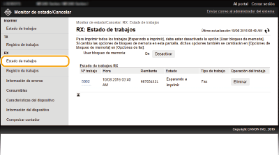 Haga clic en [Nº trabajo] mientras un trabajo de fax se encuentre en espera de impresión para ver los detalles del fax. Podrá comprobar el remitente, el número de impresiones, las posibles imágenes recibidas y otras informaciones. Previsualización de documentos desde la IU remota