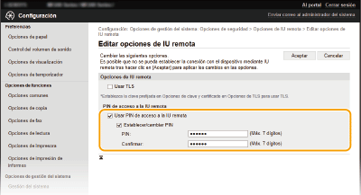Marque la casilla de verificación [Usar PIN de acceso a la IU remota] y establezca el PIN.