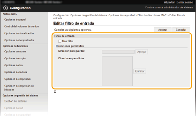 ![]() Comprobación de los errores de entrada Si las direcciones MAC se introducen de forma incorrecta, es posible que no pueda acceder al equipo desde la IU remota, en cuyo caso deberá establecer <Filtro de direcciones MAC> en <Off>. Filtro de direcciones MAC