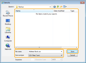 The file formats that can be written out from the fax driver are the following two: CSV file (*.csv) and Canon Address Book file (*.abk).