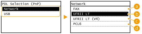 Select a page description language so that the machine is detected as a printer that is compatible with that language when it is connected to a computer by using Plug and Play. For more information, see "MF Driver Installation Guide."