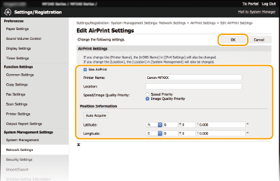 Enter the name and the installation location information to help you identify this machine when operating your Apple device. This information is useful if you have more than one AirPrint printer. Also select whether to give priority to print speed or to print quality.