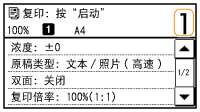 视进行的复印设置而定,复印多份文档时会显示文档尺寸的选择画面。请按照以下步骤操作。