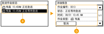 2 | 选择您要检查状态的文档。 ![]() <发送作业状态>/<传真接收作业状态>显示正在发送和接收或等待处理文档的列表。 <详细信息>显示从列表选择的文档的详细信息。如果指定了多个接收方,画面上会显示指定接收方的数量。若要查看所指定的多个接收方的详细信息,请轻触 <接收方>。如果发现不需要的文档,请轻触 <取消> 或 <删除>,然后轻触 <是>。 |