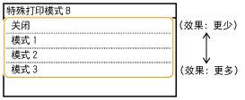 指定 <关闭> 或 <模式1> 时,打印纸上可能出现条纹。指定 <模式3> 或 <模式4> 时,轮廓可能变模糊或图像可能会出现少许颗粒。打印浓度会随着设置从 <关闭> 逐渐变为 <模式4> 而变淡。