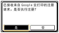 从移动设备或 Google Chrome 注册也可以从移动设备或 Google Chrome* 注册本机。本机的显示屏在完成注册前会显示如下确认画面。轻触 <是> 完成注册。 * 有关注册步骤,请参阅移动设备使用说明书或Google云打印网站。 |