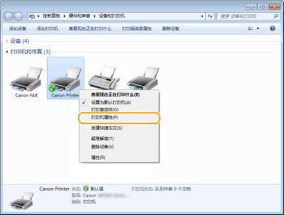 右击打印机图标,然后单击 [打印机属性](或 [属性])。