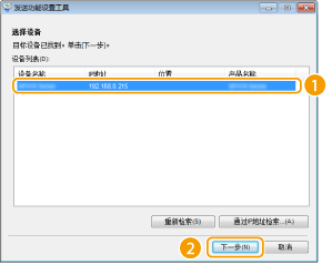5 | 在 [设备列表:] 中选择本机,然后单击 [下一步]。 如果 [设备列表:] 中未显示本机 单击 [重新检索]。如果问题仍然存在,请单击 [通过IP地址检索],输入本机的 IP 地址,然后单击 [确定]。 |