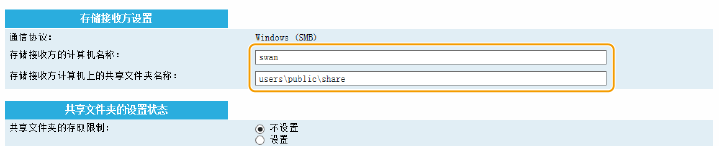单击 [不设置] 或 [设置] 单选按钮以匹配对共享文件夹设置的访问限制。选择 [设置] 时,在 [注册的用户名:] 文本框中输入用户名,并在 [存取密码:] 文本框中输入密码。