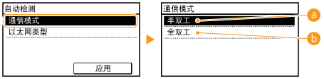以太网是局域网 (LAN) 中通信数据的标准。可以设置通信模式(半双工/全双工)和以太网类型(10BASE-T/100BASE-TX)。通常,无需更改默认设置即可使用本机(