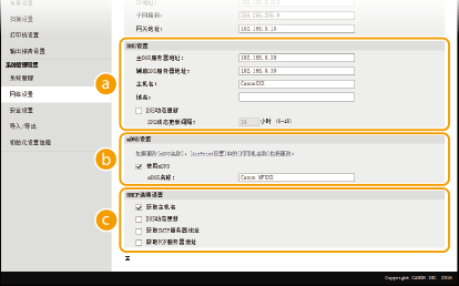 2 | 配置 IPv4 DNS 设置。 可设置的选项可能因机型而异。 ![]() [DNS设置][主DNS服务器地址] 输入 DNS 服务器的 IP 地址。 [辅助DNS服务器地址] 如果有辅助 DNS 服务器,请输入其 IP 地址。 [主机名] 为要注册到 DNS 服务器的本机主机名输入最多 47 个字母数字字符。 [域名] 为本机所属的域名输入最多 47 个字母数字字符,例如“example.com”。 [DNS动态更新] 选中该复选框可在本机的 IP 地址更改时动态更新 DNS 记录。指定更新间隔时,请在 [DNS动态更新间隔] 文本框中以小时为单位输入时间。 [mDNS设置][使用mDNS] mDNS(多路传送 DNS)是不通过 DNS 将主机名与 IP 地址相关联的协议,Bonjour 采用的就是该协议。选中此复选框启用 mDNS,然后在 [mDNS名称] 文本框中输入 mDNS 名称。 [DHCP选项设置][获取主机名] 选中此复选框可启用选项 12,以从 DHCP 服务器获得主机名。 [DNS动态更新] 选中此复选框可启用选项 81,以通过 DHCP 服务器动态更新 DNS 记录。 [获取SMTP服务器地址] (MF249dw / MF246dn) 选中此复选框可启用选项 69 以从 DHCP 服务器获得 SMTP 服务器地址。 [获取POP服务器地址] (MF249dw / MF246dn) 选中此复选框可启用选项 70 以从 DHCP 服务器获得 POP3 服务器地址。 |